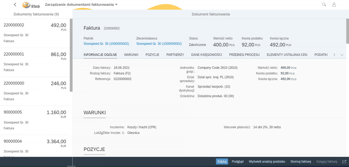 - wyświetlenie informacji o firmie, warunków płatności (na przykład zapłać natychmiast bez potrąceń), warunków incoterms i problemy z dokumentami rozliczeniowymi